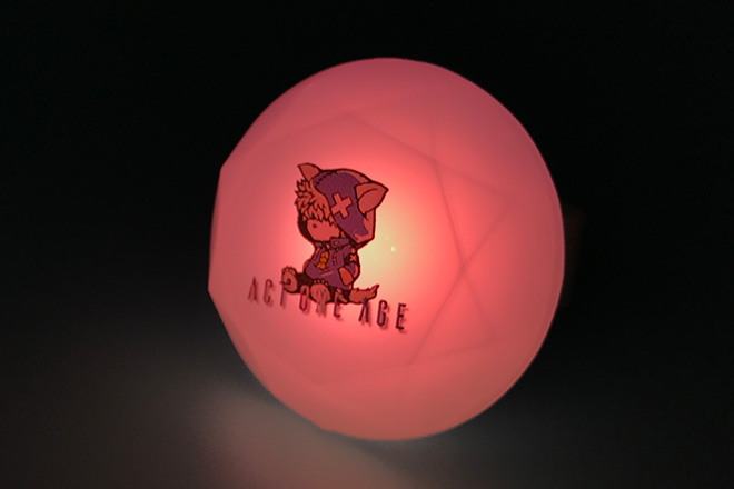 お客様からのご注文で製作したリングライトです。形状は、本体をカットした断面が特徴的なダイヤ型です。印刷面の中央には、ブルーのパーカーを着たキャラクターが配置されています。イラストの縁取りが丁寧に描かれており、ライトの発光カラーに美しく映えるデザインです。