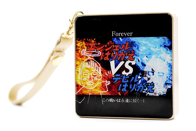 株式会社あきらめないさまは、企業の経営幹部・次世代リーダー育成をサポートする研修を提供している企業様です。今回のスクエアモバイルバッテリーは、受講生の皆様にお配りするオリジナルグッズとして制作させていただきました。スクエアモバイルバッテリーの片面には、会社のロゴマークと企業様らしいワンフレーズを印刷。落ち着きのある、スマートでおしゃれな仕上がりとなりました。反対面には講師の似顔絵イラストを印刷。ユニークでインパクトのあるデザインとなっており、炎の細かい描写までしっかりと再現しています。お客様のイメージにぴったり合うスクエアモバイルバッテリーが完成しました。